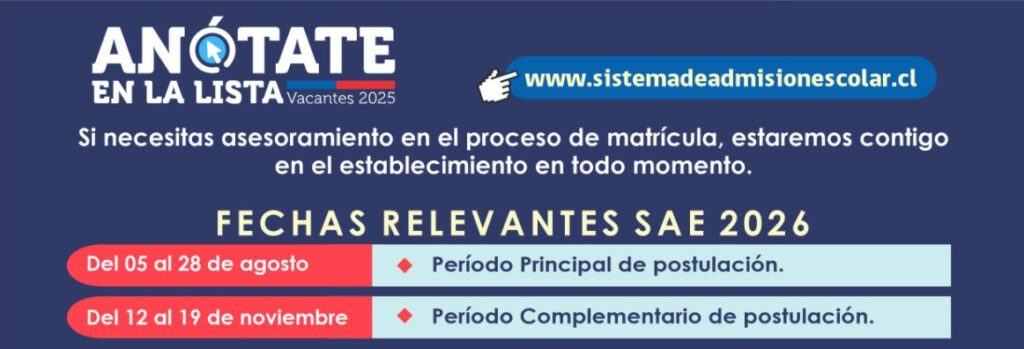 Los Apoderados que deseen matricular por primera vez a su (s) Estudiantes (s) en este Establecimiento para todos los cursos, lo deben realizar a través del nuevo Sistema de Admisión Escolar del Ministerio de Educación, dando clic en la imagen: